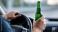• Man driving car holding a green beer bottle, depicting drunk driving, impaired judgement, irresponsibility, danger, and illegal behavior on the road with copy space