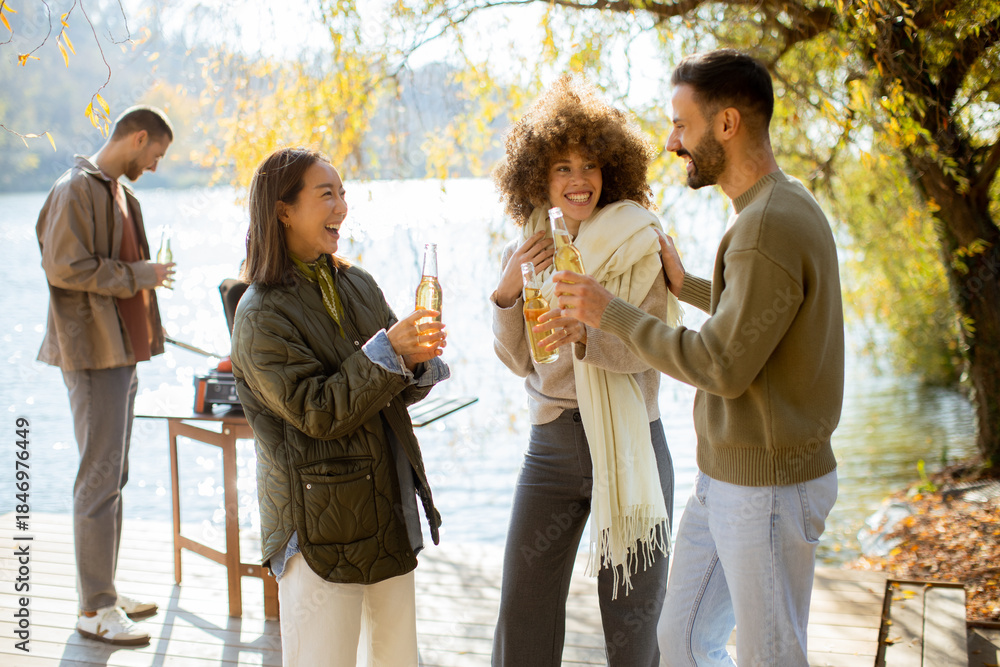 • Friends celebrate by the lakeside, enjoying drinks and playfulness on a sunny day