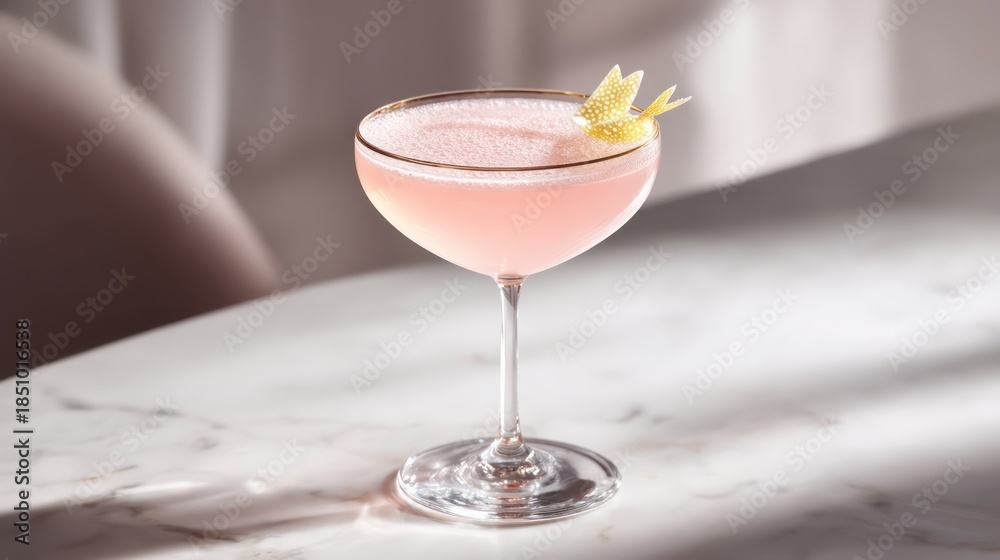 Do Restauracji - A coupe containing glowing pastel pink cocktail crowned with delicate citrus twist garnish. Rim... #1851016538