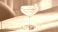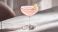 • A coupe containing glowing pastel pink cocktail crowned with delicate citrus twist garnish. Rim reflects faint under soft spotlight.