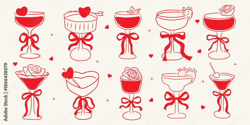 • Valentine’s Day romantic cocktail doodle set. Hand drawn love drink icons with roses, strawberry and bows for greeting cards, wrapping paper, stickers, party invitations