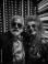 • Bearded man and woman dressed in fashionable attire and sunglasses enjoying vibrant neon lights at a New Year disco party.