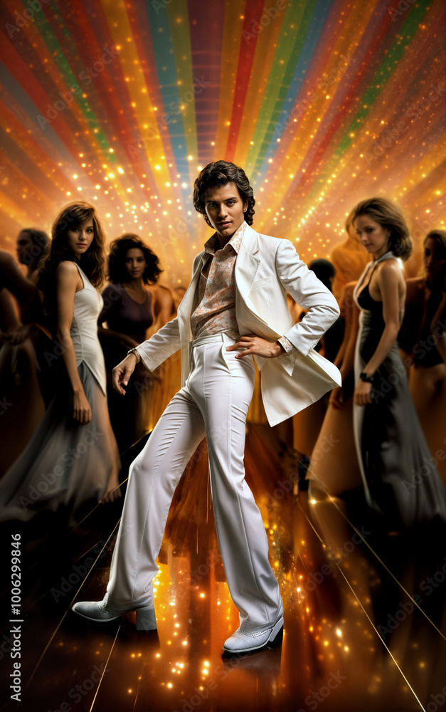 • Retro disco dancer man in white suit and flared pants posing with vibrant 70s dance floor background. Pickup artist concept