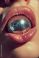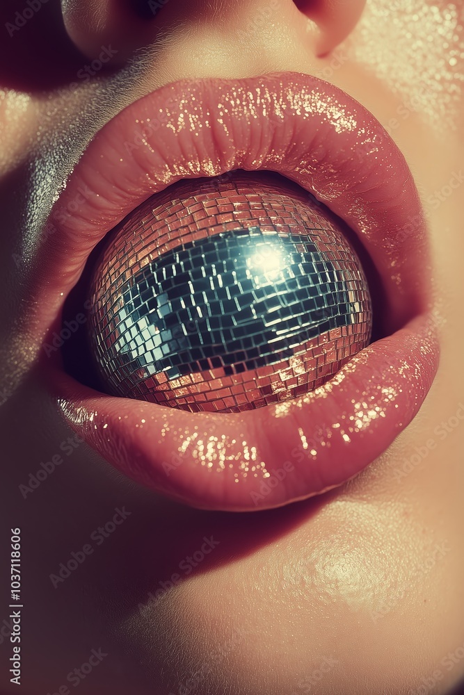 • Close-up of shiny lips gripping a reflective disco ball, showcasing a blend of glamour and nightlife energy.