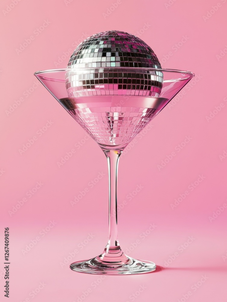 Do Szkoły Tańca - Elegant martini glass with a disco ball on a pink background with space for text, ideal for party... #1267409876