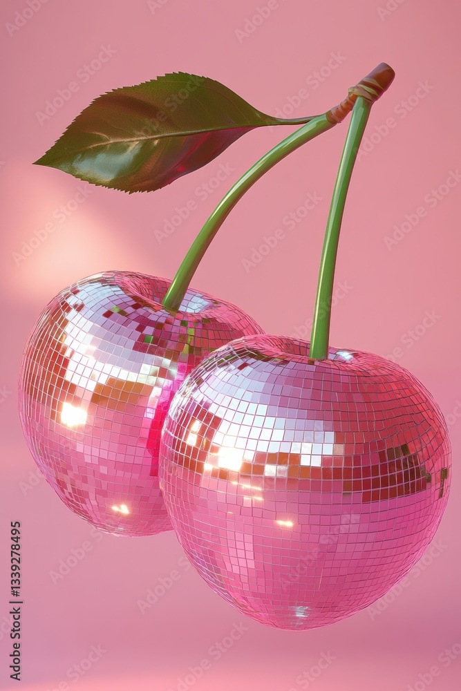 • Reflective cherry-shaped disco balls with green leaves against a soft pink background create a vibrant and playful visual experience