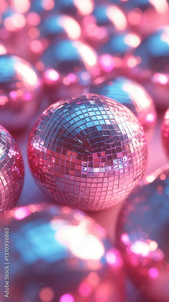 • Captivating close up of vibrant disco balls reflecting pink and blue light creating a nostalgic and festive atmosphere for celebration