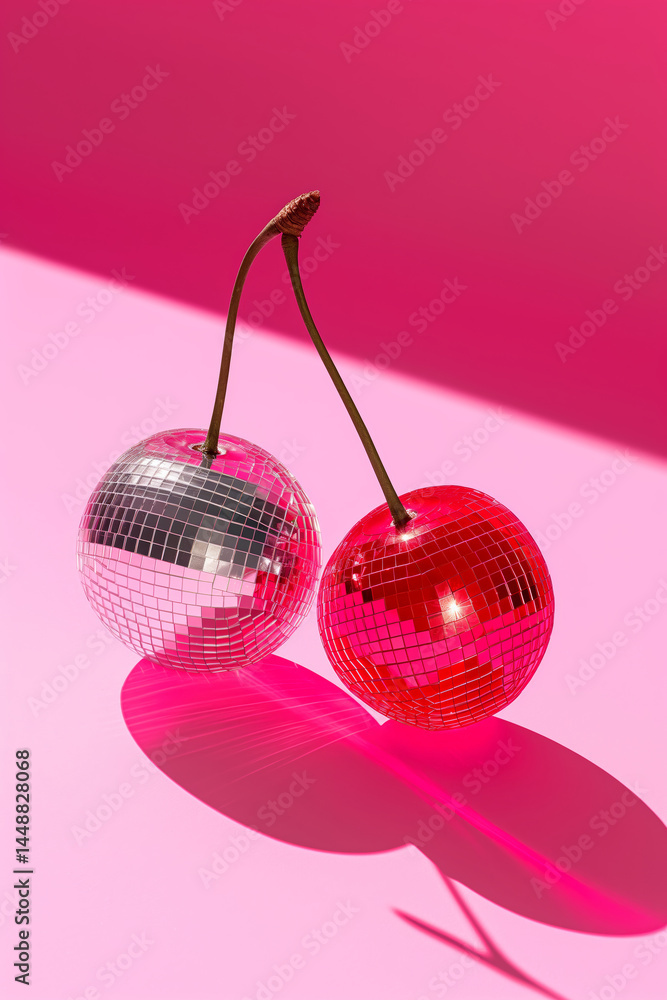 • Two shiny disco cherries casting vibrant shadows. Summer party concept.