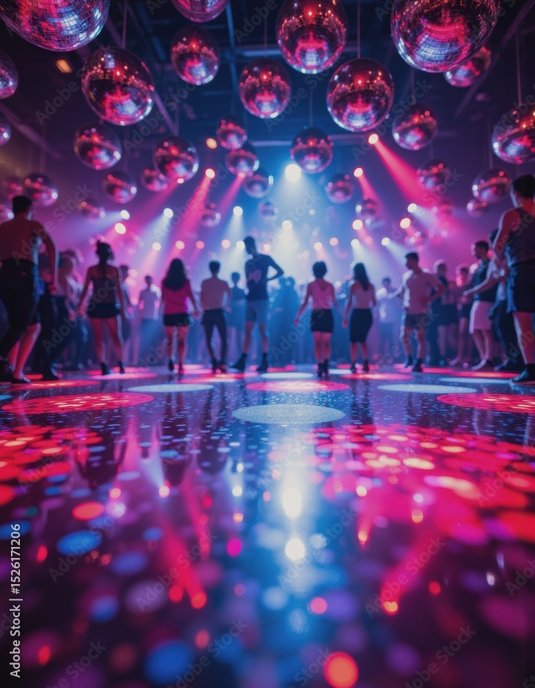 • Dance floor illuminated by vibrant disco lights and mirrored balls