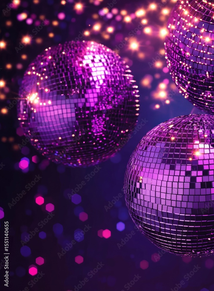 • Purple disco balls in a dark, glittering background