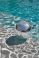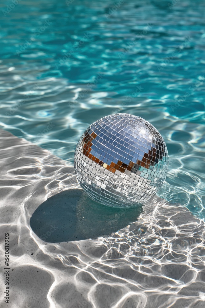 Shimme disco ball floating on water surface with ripples in the sunlight creating reflections and shadows du daytime