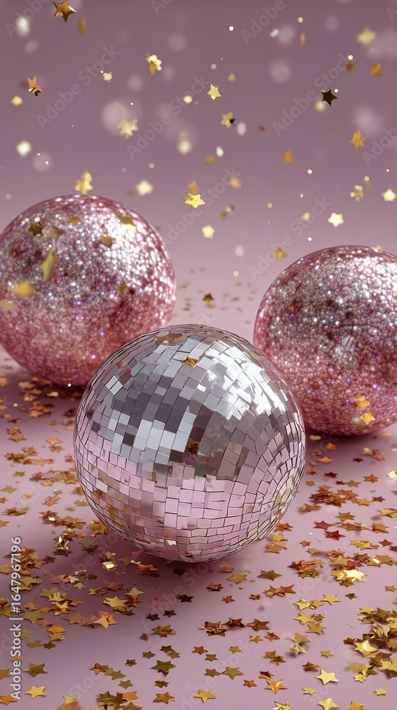 • Colorful Disco Balls Reflect Light With Golden Stars on a Vibrant Pink Background at a Festive Event.