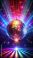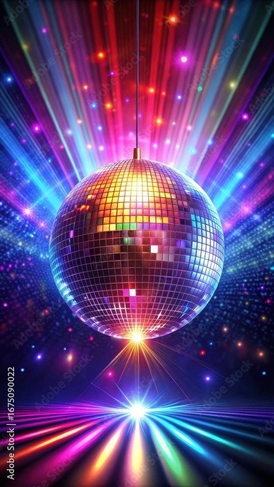• Dazzling disco ball spinning on a dark background with flashing lights and colorful neon hues