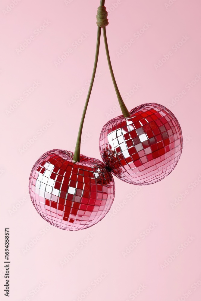 Do Szkoły Tańca - Pair of cherries, reflective disco balls, suspended soft pink background, shiny metallic effect,... #1694358571
