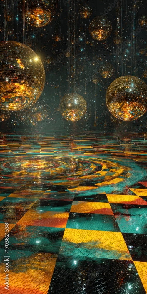 Do Szkoły Tańca - Golden disco balls above checkered floor #1703821538