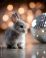• A fluffy rabbit sits beside a shimmering disco ball, evoking joy and wonder.