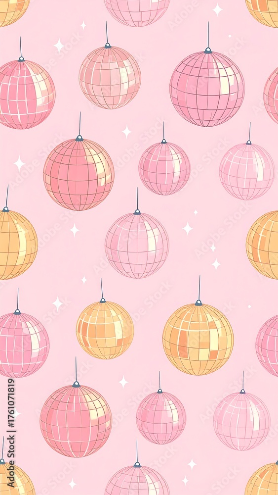 • Repeating pattern of colored, reflective sphere decorations and star shapes