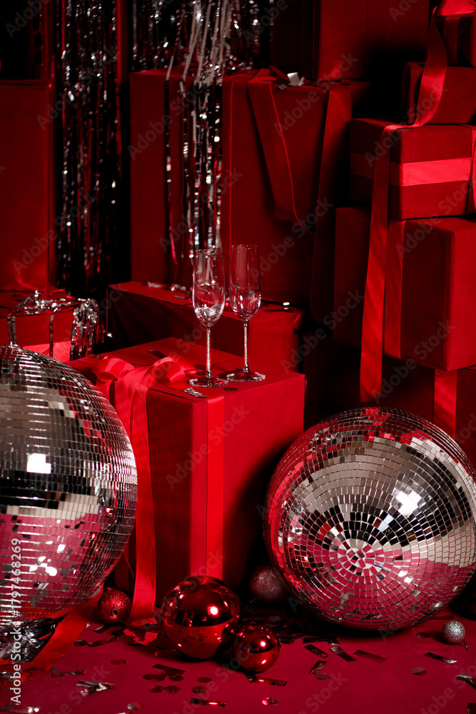 Do Szkoły Tańca - Luxury holiday decoration with red presents, silver tinsel and disco balls #1797468269