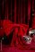• Red glamorous Christmas party scene with gifts, disco balls and silver tinsel