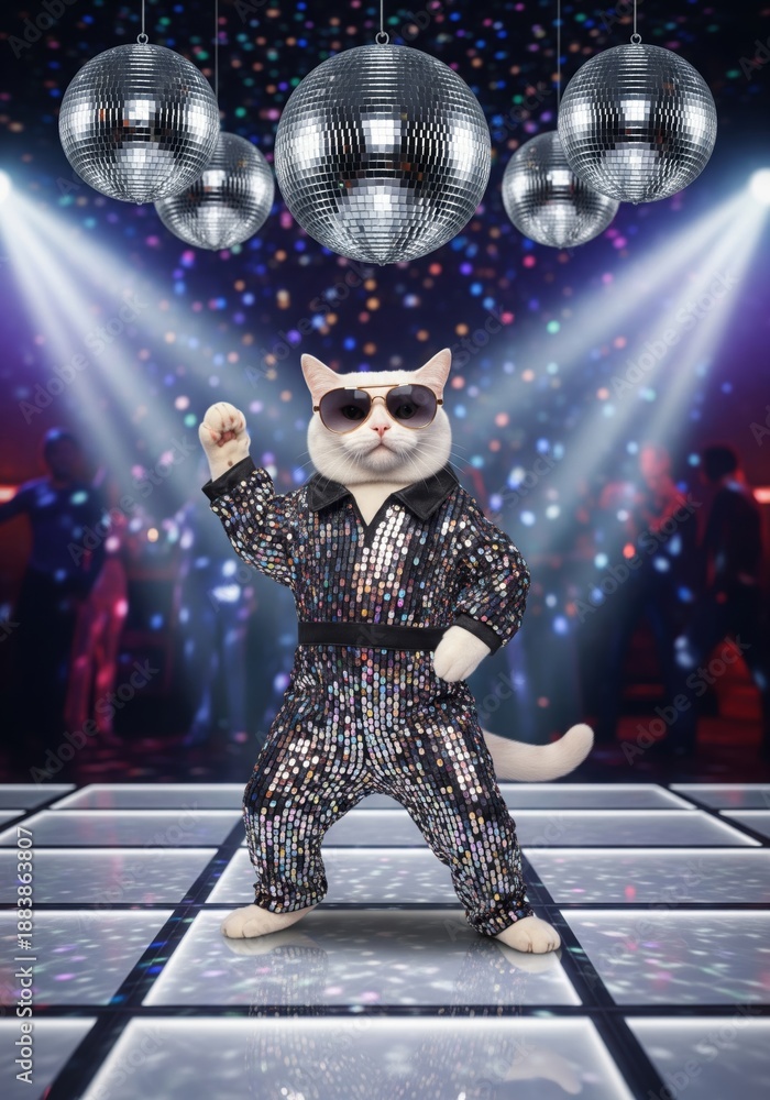 Do Szkoły Tańca - White Cat wearing disco costume and sunglasses dancing under mirror balls in nightclub interior.... #1883863807