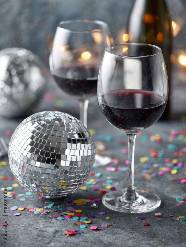 Do Szkoły Tańca - Elegant wine glasses with disco ball and confetti on table #1898051065