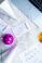 • Admin night party - work with fun. Top view of laptop with confetti and disco ball