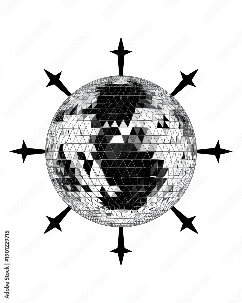 • A glittering disco ball with radiating light patterns in a monochrome setting