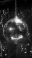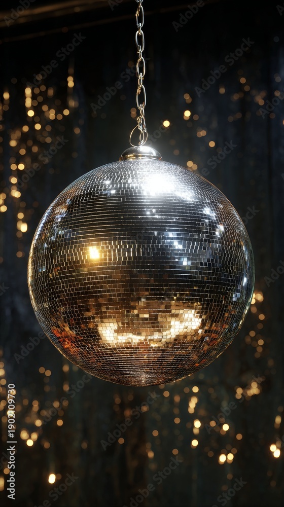 • Sparkling disco ball hanging in dark room with golden lights