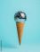 • Party composition with ice cream cone and shiny disco ball on pastel blue background. Creative birthday or Christmas celebration concept. Minimal sweet food surreal advertisement idea.