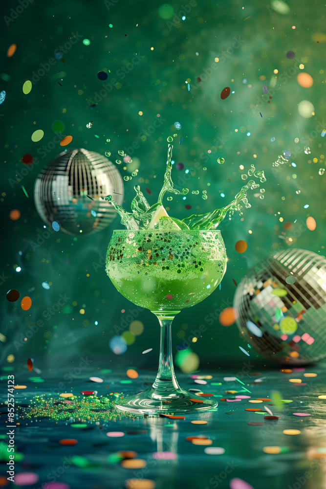 Do Szkoły Tańca - fresh green cocktail with splash in the foreground with confetti and disco ball on the table,... #852574123