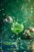• fresh green cocktail with splash in the foreground with confetti and disco ball on the table, green background, party vibe, neon light effect