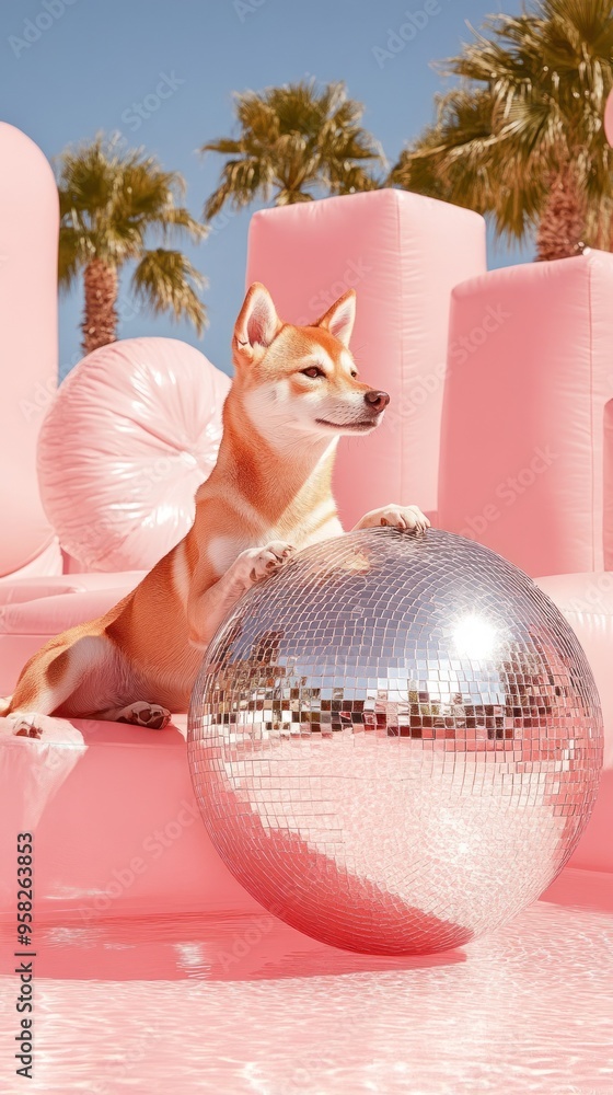 Do Szkoły Tańca - Shiba Inu with disco ball in a festive pink pool setup #958263853