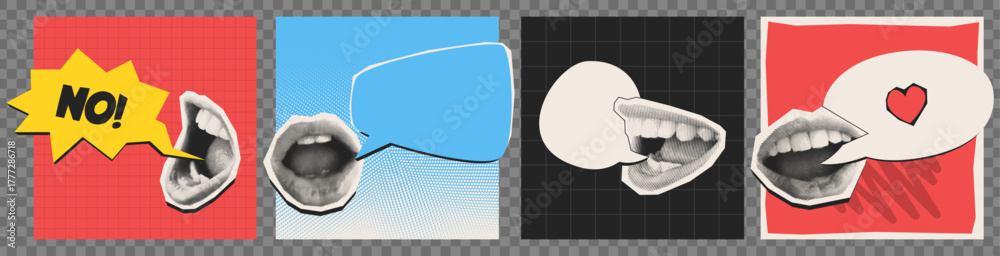 • Halftone mouth speech bubbles set isolated on color backgrounds. Contemporary vector illustration of female lips smiling, talking, saying message, retro gossip collage elements, secret discussion