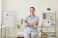 • Portrait of successful, smiling and happy female professional at work. Positive laughing young woman posing and leaning on desk while standing with crossed arms in a office of a medical clinic.