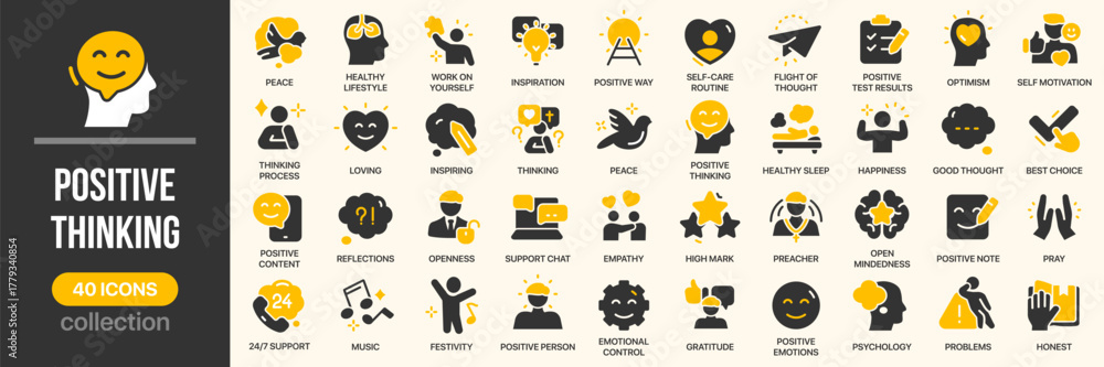 • Positive thinking fill icon collection. Includes motivation, happiness, emotions, optimism, and inspiration icons. Created in colored style with yellow and gray palette