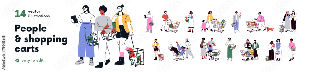 • Customers with shopping carts and grocery trolleys set. Buyers, consumers with supermarket baskets. People walking with pushcarts. Flat graphic vector illustrations isolated on white background