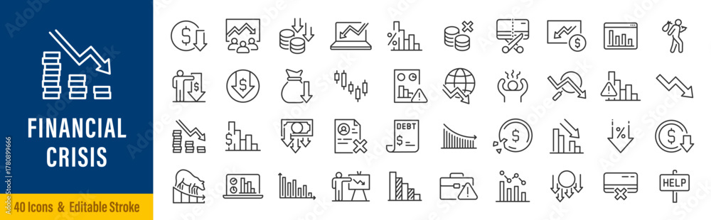Do Łazienki - Financial crisis web icon set in line style. Decrease, recession, collapse, layoff, panic, job... #1780899666