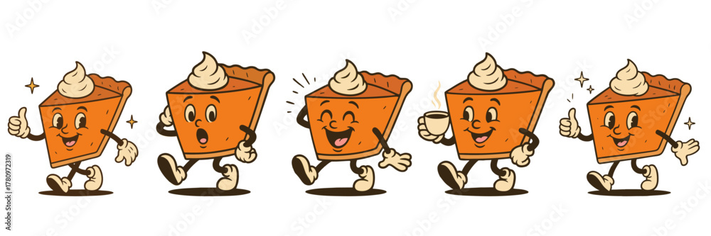 • Cute vintage pumpkin pie character with whipped cream walking happily for festive thanksgiving holiday design