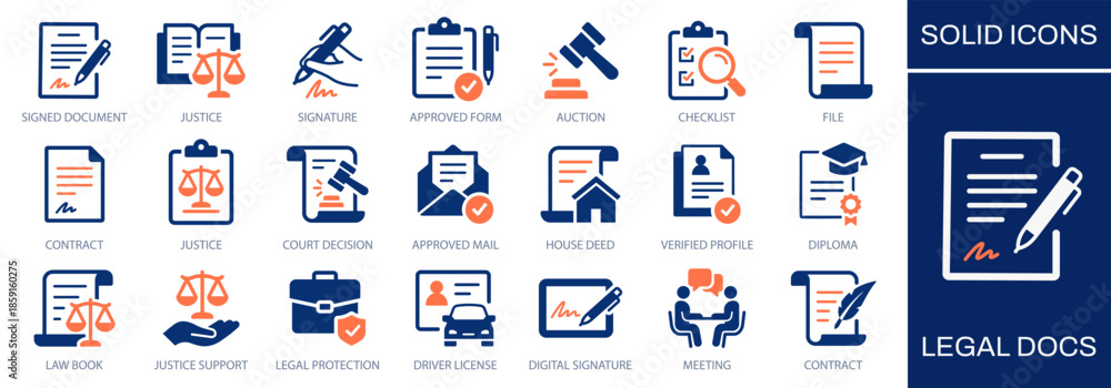 • Legal docs icon set. Showing adjudication, signatures, justice symbols, verification, approval and official documentation processes. Solid vector icons collection.