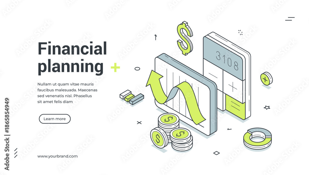 • Financial planning accounting analyzing isometric web banner design template vector illustration. Business finance bookkeeping analysis profit dynamic diagram strategy development optimization