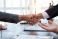 • Lawyers or business partners shaking hands after reaching an agreement or closing a deal, with a contract on the table
