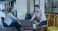 • Colleagues casually dressed talking at office lounge, with open laptop, coffee cup and potted plant