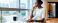 Pejzaże - Woman using laptop and thinking while working near large window #1746283130