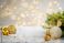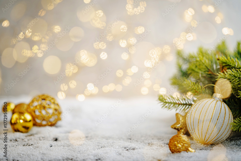 Christmas Holiday background with snow, fir tree and decorations with christmas light behind. Christmas golden balls on a winter festive background.