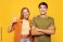 • Young happy couple friends family man woman wears shirt casual clothes together put hand on shoulder look camera isolated on pastel plain light yellow background studio portrait. Lifestyle concept