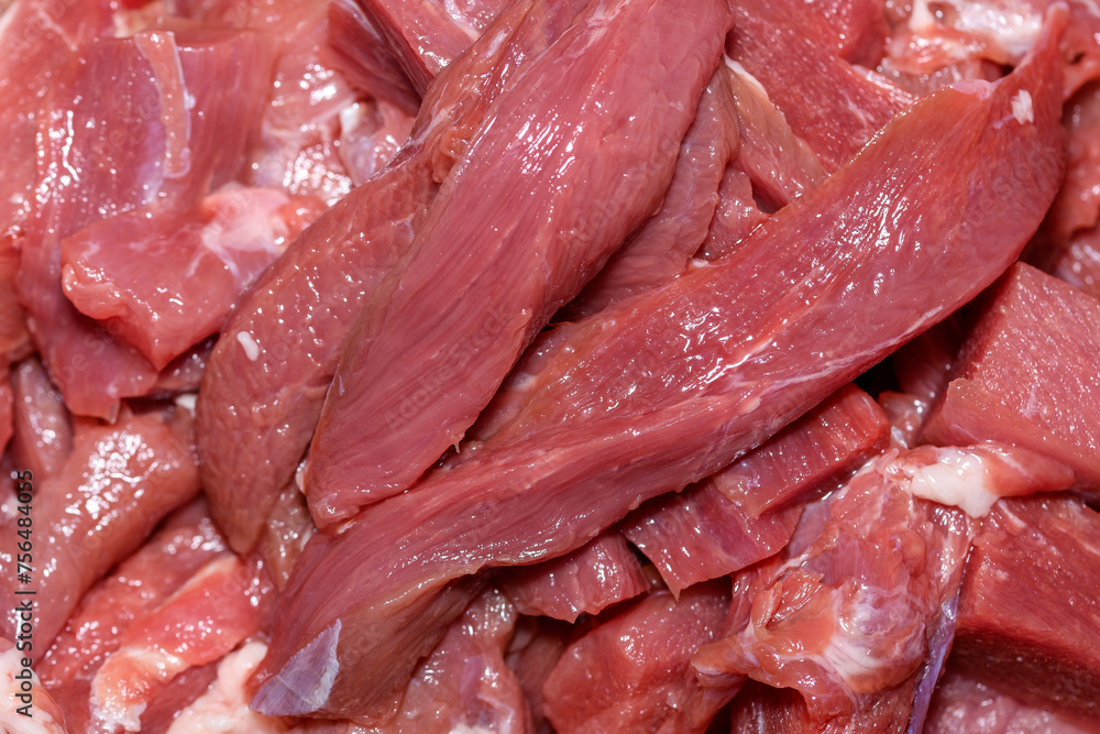 Jedzenie i Napoje - Czerwone surowe mięso z dzika pokrojone na kawałki z bliska #756484055