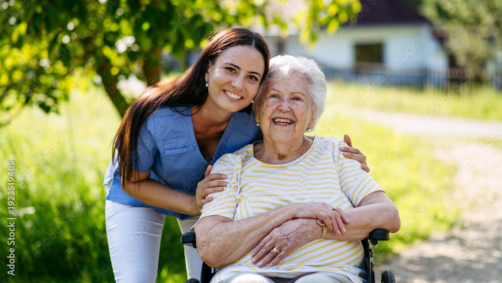 Pejzaże - Home nurse taking care of elderly woman in wheelchair. #1923519485