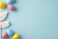 • Happy Easter greeting scene featuring pastel decorated egg and playful bunny ears arranged on a soft blue background for spring celebration and seasonal decoration