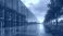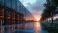 • Modern glass building facade with glowing server racks inside. Exterior view of data center at sunset with paved walkway and green lawn. Tech infrastructure with lights reflecting on wet pavement.