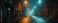 • Dark urban street at night. Wet asphalt reflects orange and blue light from streetlamps. Buildings line the deserted road shrouded in fog, creating a mysterious, tense atmosphere.